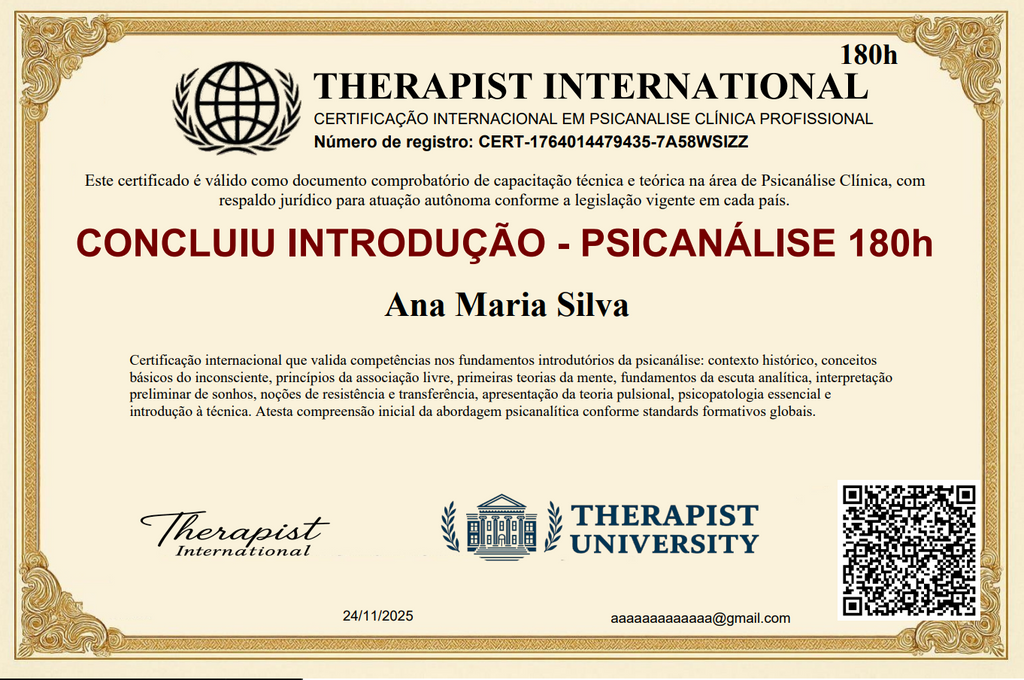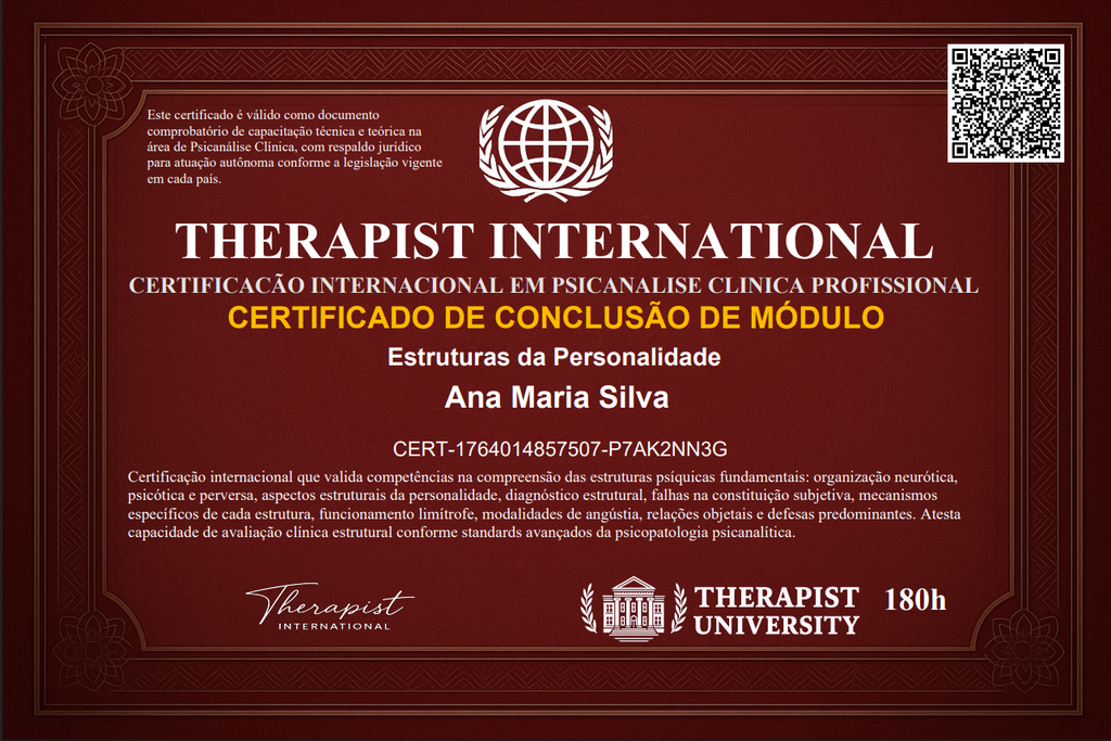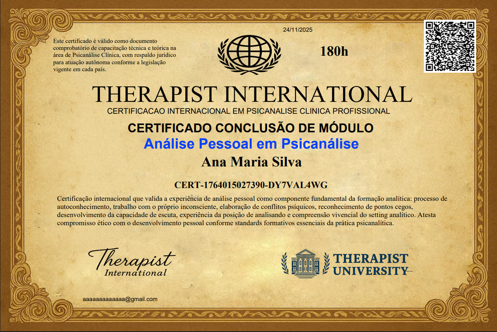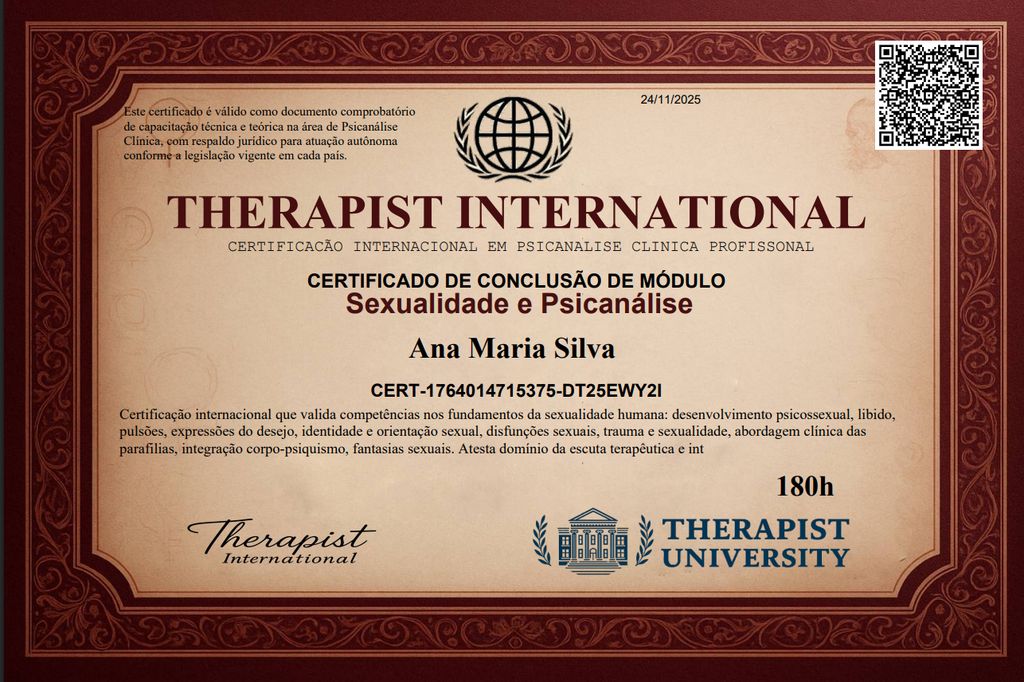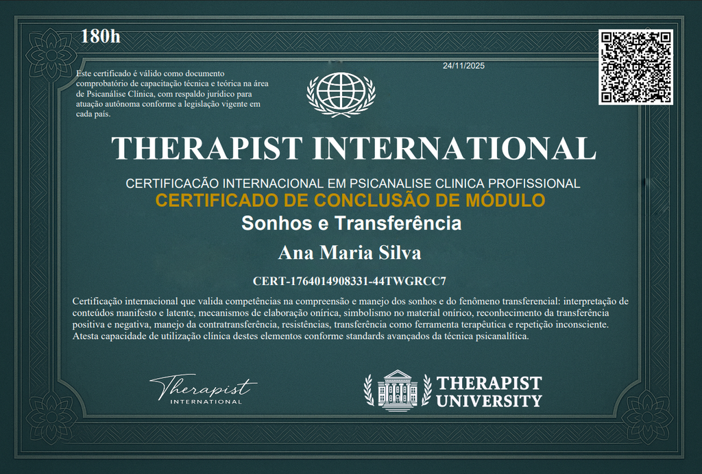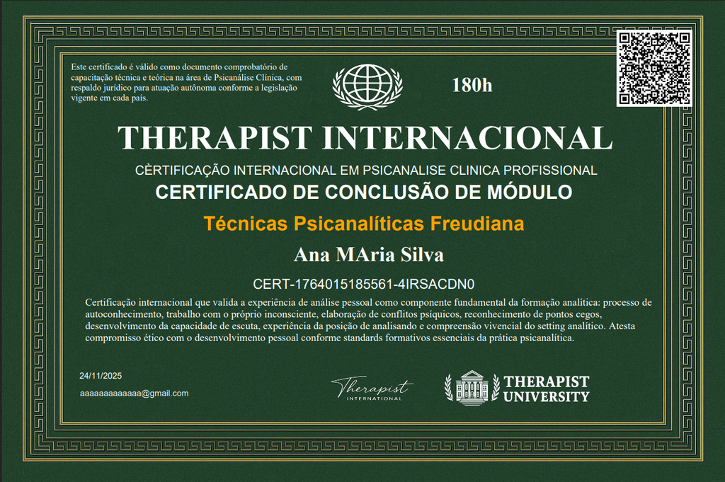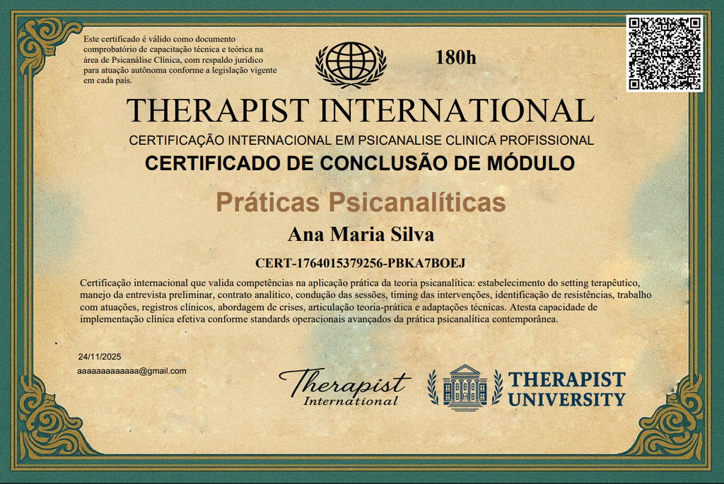 Os Certificados Internacionais reconhecidos pelo MEC representam o mais alto padrão de validação acadêmica disponível na formação em Psicanálise. Emitidos conforme as diretrizes do Ministério da Educação, esses documentos asseguram que o curso segue critérios formais de qualidade pedagógica, carga horária regulamentada, estrutura curricular adequada e conformidade institucional.