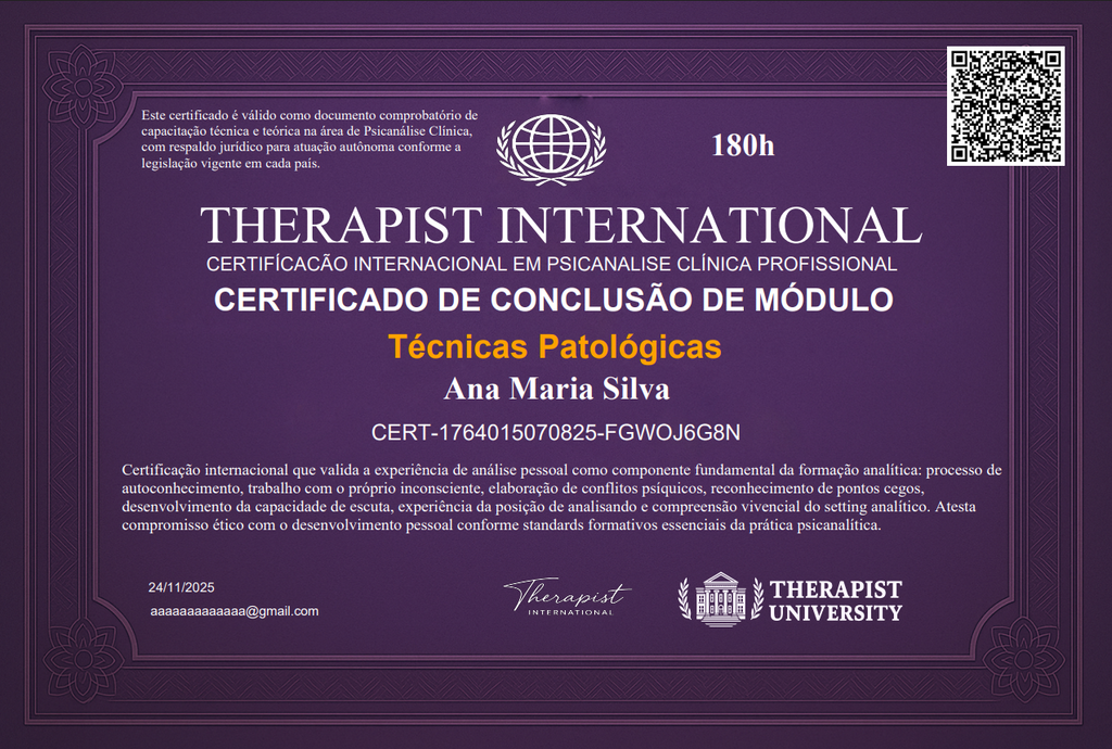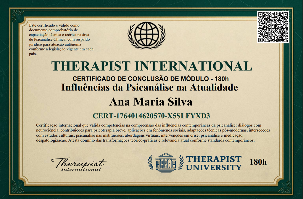 Cada certificado possui registro oficial, validação por QR Code e identificação individual do aluno, permitindo comprovação pública e autenticidade internacional. Esse reconhecimento garante que o profissional formado possa utilizar sua titulação com total segurança em seleções, pesquisas acadêmicas, concursos que aceitam certificações livres, atendimentos clínicos e atividades profissionais em diversos países.