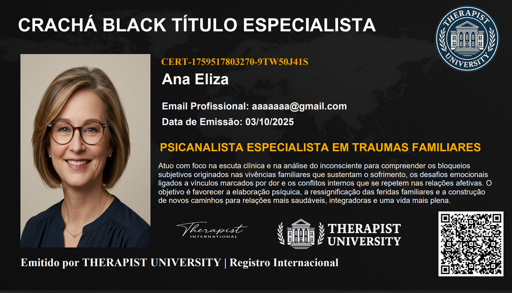 O Registro de Psicanalista Especialista em Traumas Familiares é um credenciamento emitido por instituições formadoras idôneas, confirmando que o profissional concluiu a especialização, domina a teoria psicanalítica aplicada aos traumas de origem familiar e realizou prática supervisionada voltada para essa área específica.