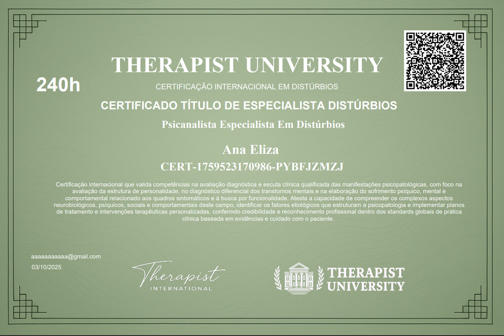 O Curso de Psicanalista Especialista em Distúrbios Psicanalíticos da Therapist University oferece certificação com validação opcional por instituições parceiras reconhecidas pelo MEC, validade internacional, QR Code, registro global e suporte completo para atuar no Brasil e em mais de 120 países.