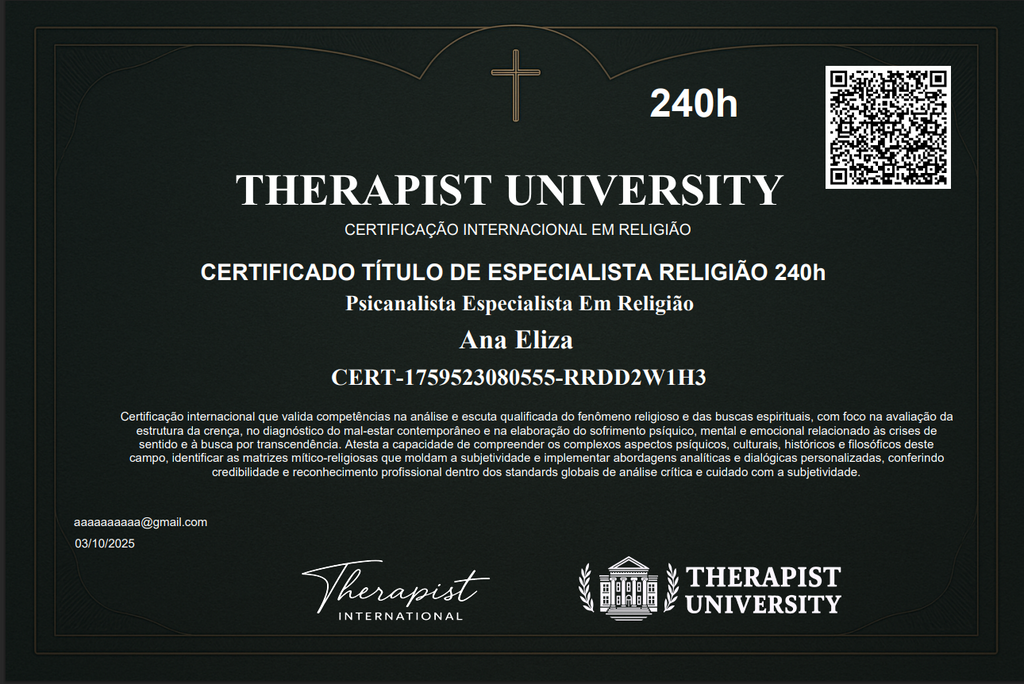 O Curso de Psicanalista Especialista em Religião da Therapist University oferece certificação com validação opcional por instituições parceiras reconhecidas pelo MEC, validade internacional, QR Code, registro global e suporte completo para atuar no Brasil e em mais de 120 países.