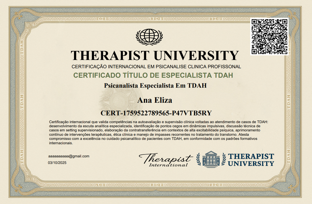 O Curso de Psicanalista Especialista em TDAH da Therapist University oferece certificação com validação opcional por instituições parceiras reconhecidas pelo MEC. Possui validade internacional, registro global, certificados com QR Code e suporte completo para atuar no Brasil e em mais de 120 países.