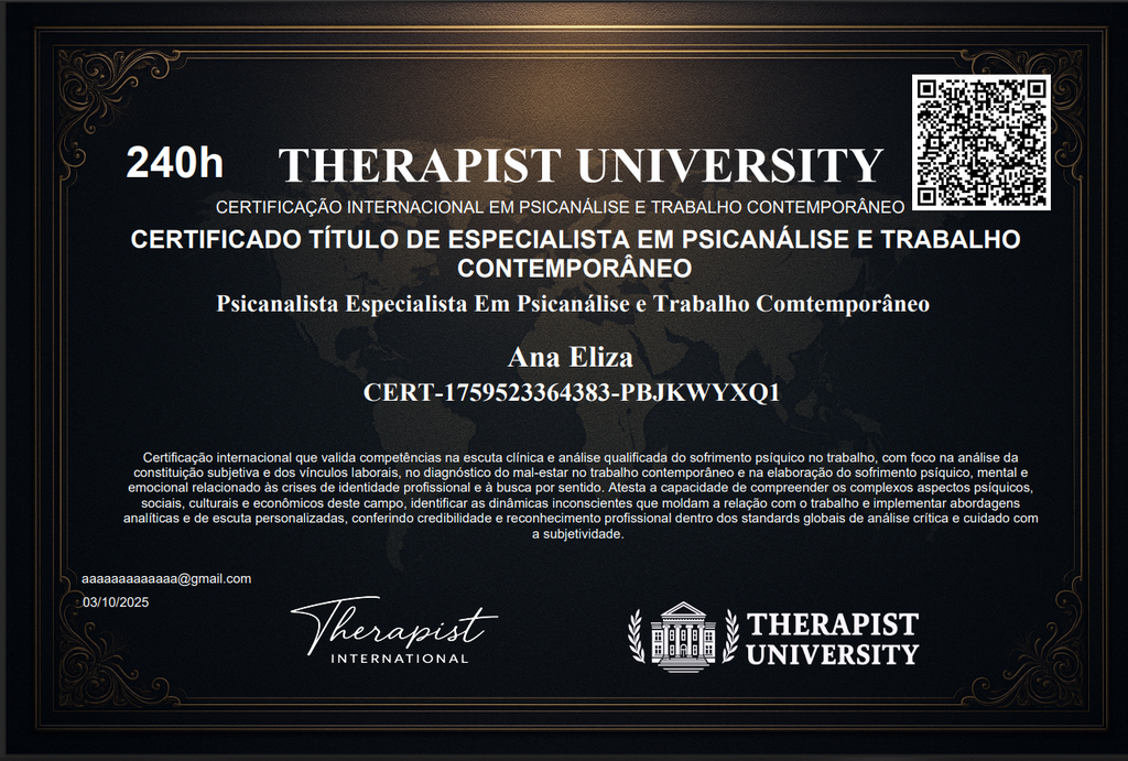 O Curso de Psicanalista Especialista em Trabalho Psicanalítico da Therapist University oferece certificação com validação opcional por instituições parceiras reconhecidas pelo MEC. Possui validade internacional, registro global, certificados com QR Code e suporte completo para atuação no Brasil e em mais de 120 países.